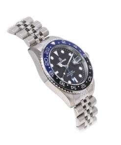 Movimento Ronda Swiss 505 24h Cassa Acciaio Diametro cassa 40 mm Spessore cassa 12 mm Ansa 20 mm Vetro Minerale con lente Fondo A vite Corona A vite Impermeabilità 10 atmosfere Cinturino Bracciale Jubilee acciaio Quadrante Nero Ghiera Nera e Blu Lancette Luminose Fibbia Chiusura di sicurezza
