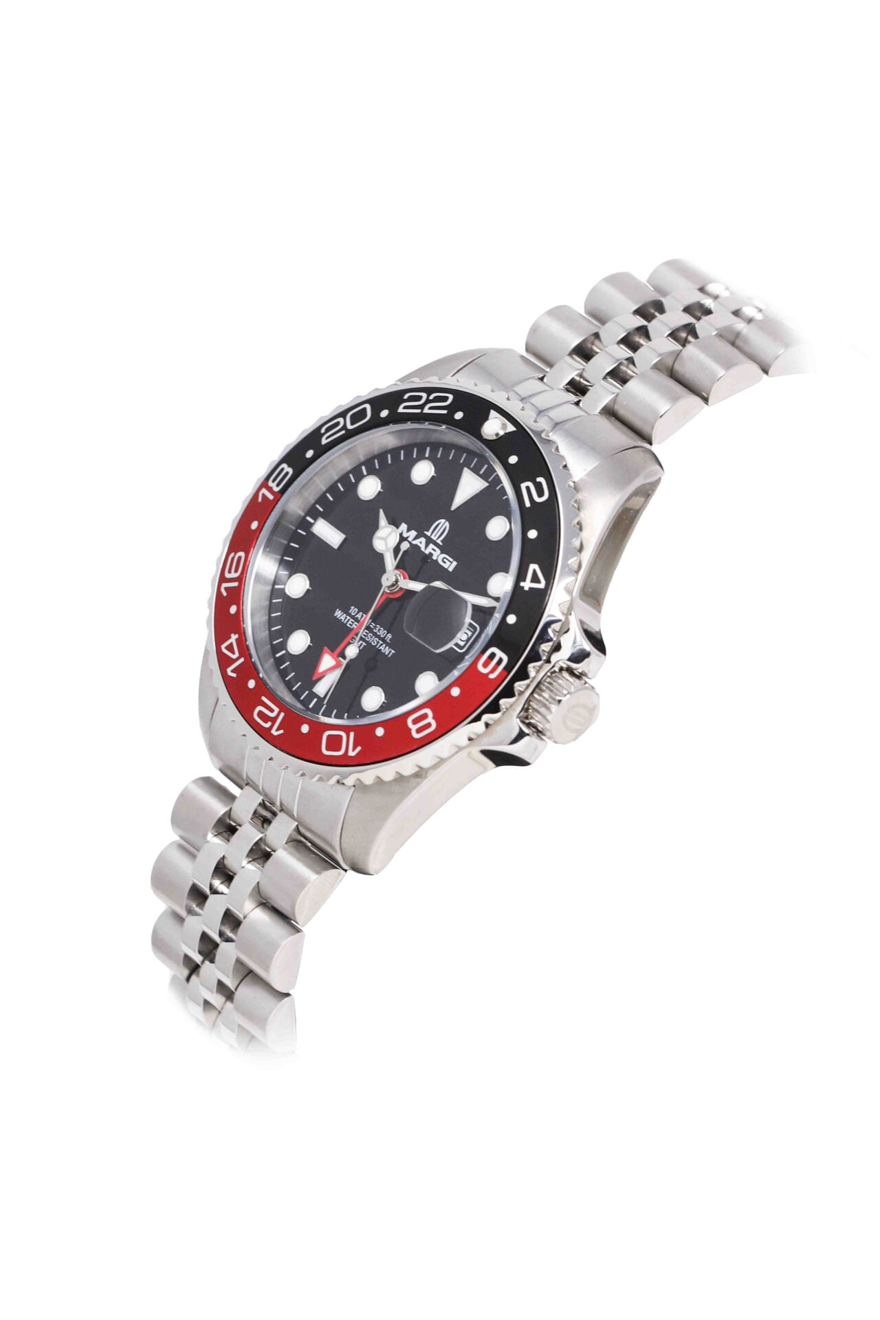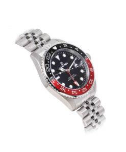 Movimento Ronda Swiss 505 24h Cassa Acciaio Diametro cassa 40 mm Spessore cassa 12 mm Ansa 20 mm Vetro Minerale con lente Fondo A vite Corona A vite Impermeabilità 10 atmosfere Cinturino Bracciale Jubilee acciaio Quadrante Nero Ghiera Nera e rossa Lancette Luminose Fibbia Chiusura di sicurezza